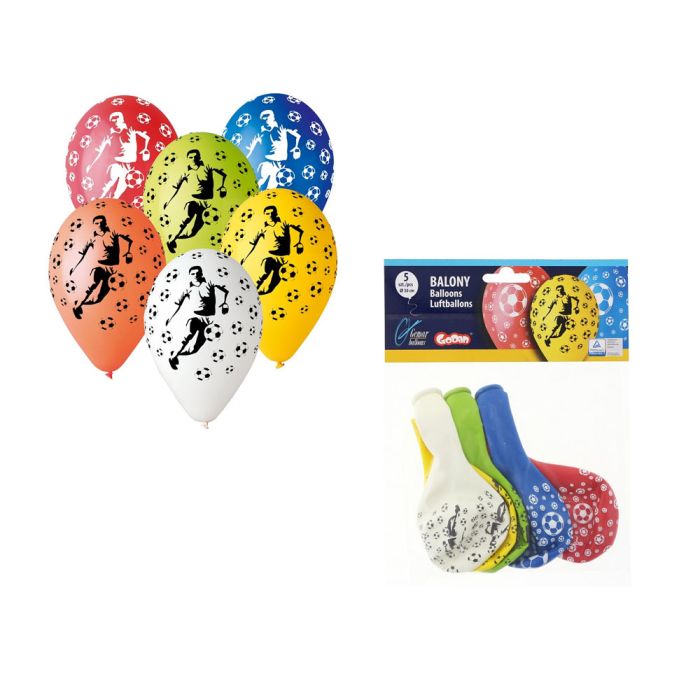 W opakowaniu znajduje się 5 szt. pastelowych kolorowych balonów z piłkami i piłkarzami.