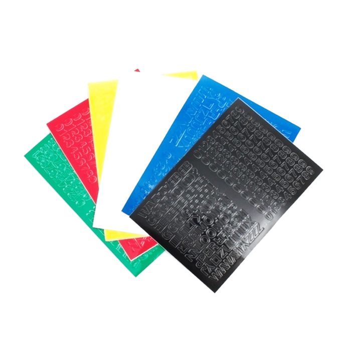 Litery i cyfry samoprzylepne na arkuszach formatu B5 o wymiarach 17,5 cm x 25 cm.